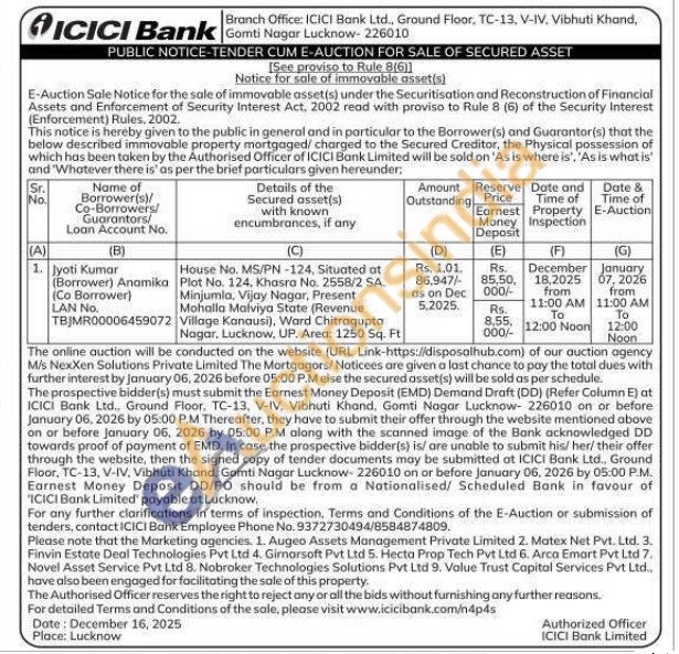House No. MS/PN-124, Situated at Plot No. 124, Khasra No. 2558/2 SA. Minjumla, Vijay Nagar, Present Mohalla Malviya State (Revenue Village Kanausi), Ward Chitragupta Nagar, Lucknow, UP. Area: 1250 Sq. Ft