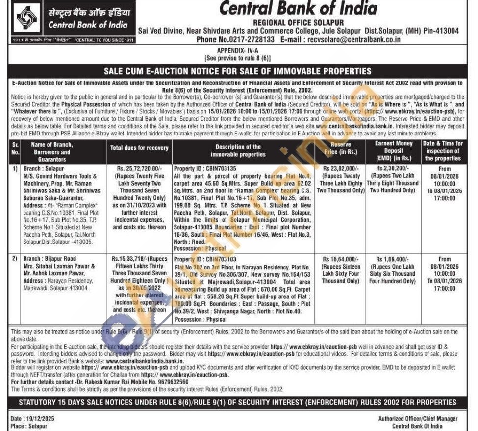 All the part & parcel of property bearing Flat No.4, carpet area 45.60 Sq.Mtrs. Super Build up area 62.02 Sq.Mtrs. on 2nd floor in "Raman Complex bearing C.S. No.10381, Final Plot No.16+17, Sub Plot No.35, adm. 199.00 Sq. Mtrs. T.P. Scheme No 1 Situated at New Paccha Peth, Solapur, Tal. North Solapur, Dist. Solapur, Within the limits of Solapur Municipal Corporation, Solapur-413005 Boundaries: East: Final plot Number 16/36, South: Final Plot Number 16/46, West: Flat No.3, North: Road.