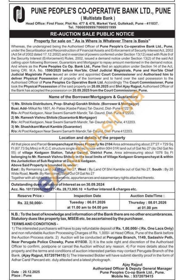 All that piece and Parcel Grampanchayat House Property No 2104 Area admeasuring about 27*27=729 Sq Ft (67.73 Sq Mtrs) in R.C.C structure single storied house within 00H 01R land out of Gat No 27 (its Old Gat No 55) of village Kedgaon Station, Taluka Daund, District Pune. Area admeasuring about 1076 Sq Ft belonging to Mr. Ramesh Vishnu Shitole in the local limits of Village Kedgaon Grampanchayat & within the Jurisdiction of Sub Registrar at Daund & Kedgaon. Above Said Property is bounded as under: East: By Remaining Land out of Gat No 27, West: By Land Of Shri Kamble out of Gat No 27, South: By 20 Wide Road, North: By Remaining Land Out Of Gat No 27