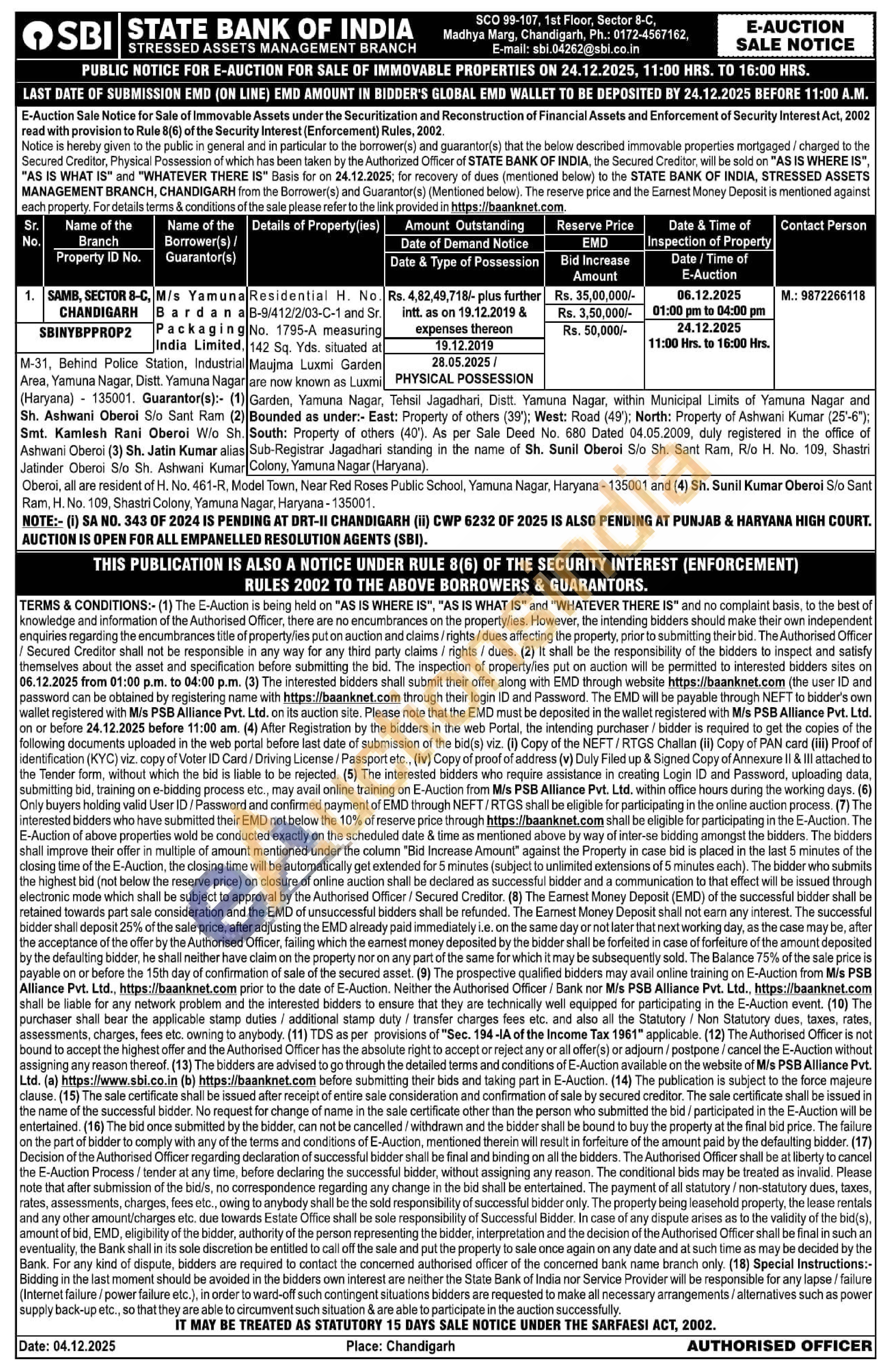 Residential H. No.B-9/412/2/03-C-1 and Sr. No. 1795-A measuring 142 Sq. Yds. situated at Maujma Luxmi Garden are now known as Luxmi Garden, Yamuna Nagar, Tehsil Jagadhari, Distt. Yamuna Nagar, within Municipal Limits of Yamuna Nagar and Bounded as under:- East: Property of others (39'); West: Road (49'); North: Property of Ashwani Kumar (25'-6"); South: Property of others (40'). As per Sale Deed No. 680 Dated 04.05.2009, duly registered in the office of Sub-Registrar Jagadhari standing in the name of Sh. Sunil Oberoi S/o Sh. Sant Ram, R/o H. No. 109, Shastri Colony, Yamuna Nagar (Haryana).