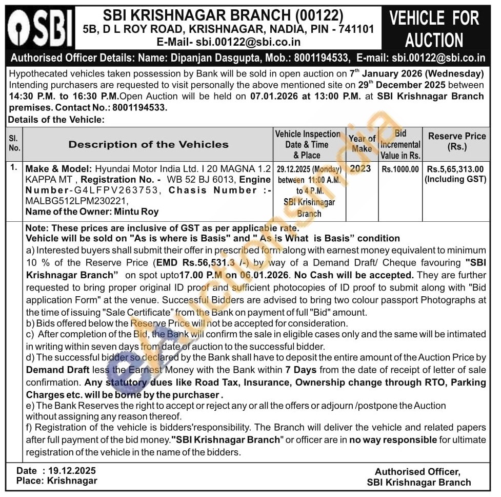 Authorised Officer Details: Dipanjan Dasgupta Mobile No : 8001194533 / SBI Krishnagar Branch premises Contact No: 8001194533