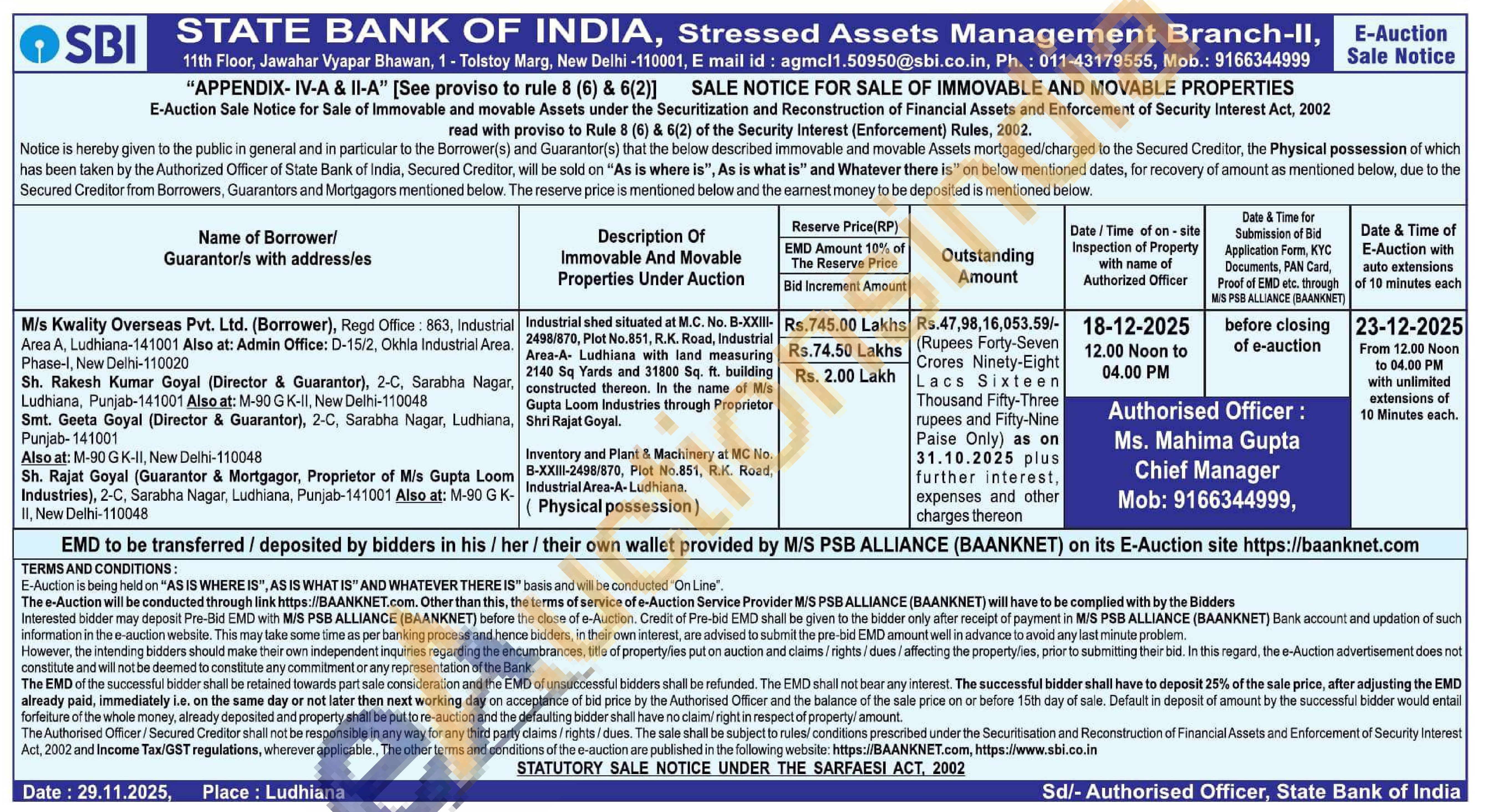 Industrial shed situated at M.C. No. B-XXII-Arsa-A- 2496/870, Ludhiana Plot No. 851, with R.K. land Road, measuring Industrial 2140 Sq Yards and 31800 Sq. ft. building constructed thereon. In the name of Mis Gupta Loom Industries through Proprietor Shri Rajat Goyal.