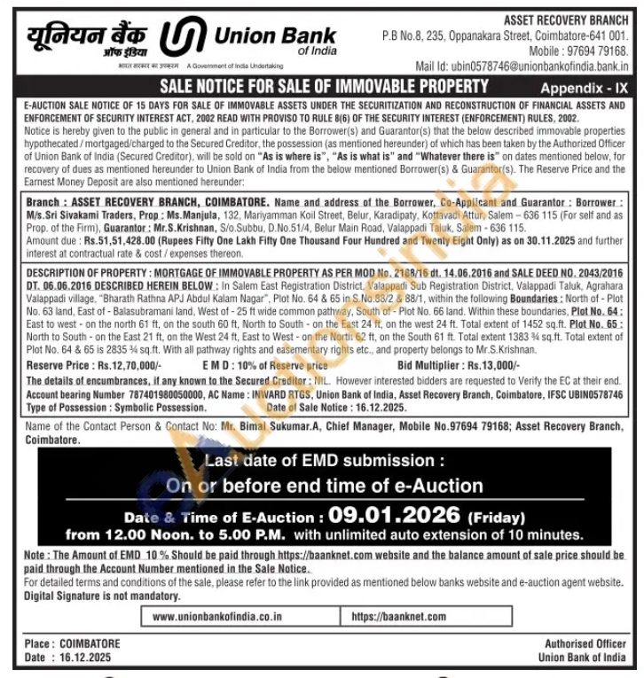 DT. 06.06.2016 DESCRIBED HEREIN BELOW: In Salem East Registration District, Valappadi Sub Registration District, Valappadi Taluk. Agrahara Valappadi village, "Bharath Rathna APJ Abdul Kalam Nagar", Plot No. 64 & 65 in S.No.88/2 & 88/1, within the following Boundaries: North of - Plot No. 63 land, East of - Balasubramani land, West of -25 ft wide common pathway, South of Plot No. 66 land. Within these boundaries, Plot No. 64: East to west on the north 61 ft, on the south 60 ft, North to South on the East 24 ft, on the west 24 ft. Total extent of 1452 sq.ft. Plot No. 65: North to South on the East 21 ft, on the West 24 ft, East to West-on the North 62 ft, on the South 61 ft. Total extent 13834 sq.ft. Total extent of Plot No. 64 & 65 is 2835 3/4 sq.ft. With all pathway rights and easementary rights etc., and property belongs to Mr.S.Krishnan
