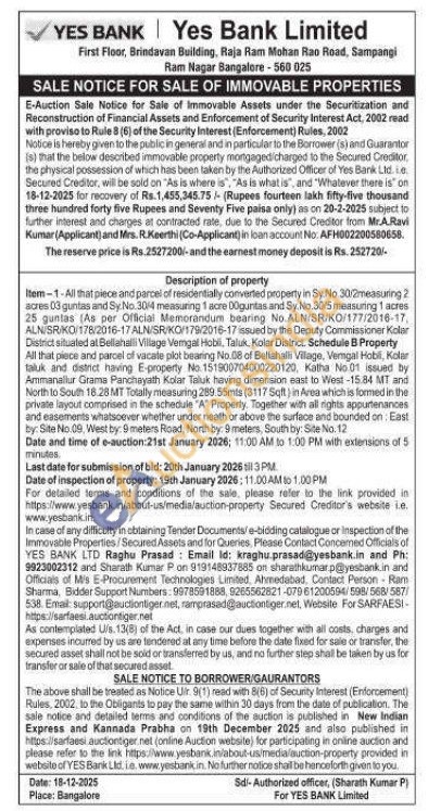Description of property : Item-1-All that piece and parcel of residentially converted property in Sy No 30/2measuring 2 acres 03 guntas and Sy. No.3014 measuring 1 acre 00guntas and Sy. No.305 measuing 1 acres 25 guntas (As per Official Memorandum bearing No. ALN/SR/KO/177/2016-17, ALN/SR/KO/178/2016-17ALN/SR/KO/179/2016-17 issued by the Deputy Commissioner Kolar District situated at Bellahalli Village Vengal Hobili, Taluk, Kolar District. Schedule B Property All that piece and parcel of vacate plot bearing No.08 of Bellahalli Village, Verngal Hobil, Kolar taluk and district having E-property No.151900704000220120, Katha No 01 issued by Ammanallur Grama Panchayath Kolar Taluk having dimension east to West-15:84 MT and North to South 18.28 MT Totally measuring 289.55mls (3117 Sqft) in Area which is formed in the private layout comprised in the schedule "A" Property, Together with all rights appurtenances and easements whatsoever whether under neath or above the surface and bounded on: East by: Site No.09, West by: 9 meters Road, North by: 9 meters, South by: Site No. 12