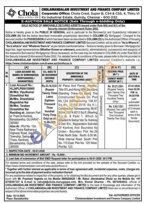 All Piece And Parcel, Interest, Title Of Land Along With Structure Standing There On Being The Constructed House On Plot No.124 Admeasuring 106.91 Sq.mt. (1150.3516 Sq.ft.). Construction Admeasuring 99.87 Sq.mt. (1074,6012 Sq.ft.) Bearing R.s.no. 8 Paiki 1, Which Is Situated At Saduji Vas Ta: Kankrej & Dist: B.k., Registration Sub-dist Of Kankrej And Bounded As Under: Boundary Plot No.29 Paiki North Side North: 6.00 ML Wide Internal Road. South: Plot No. 115 East: Plot No. 125 West