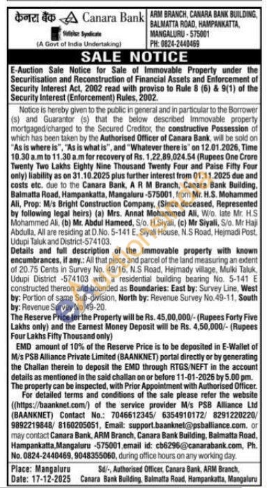 All that piece and parcel of the land measuring an extent of 20.75 Cents in Survey No. 49/16, N.S Road, Hejmady village, Mulki Taluk Udupi District -574103 with a residential building bearing No. 5-141 E constructed thereon