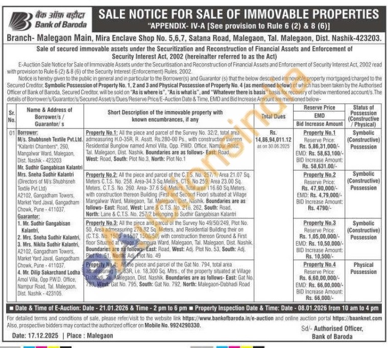 Property No.3: All the piece and parcel of the Survey No 49/50/249, Plot No. 50. Area admeasuring 278.82 5q. Meters, and Residential Building their on (C.T.S. No. 1506 1507 1508/50) with construction thereon Ground & First floor Situated at Village Istampura Ward, Malegaon, Tal. Malegaon, Dist. Nashik. Boundaries are as follows- East: Road, West: Adj. Plot No. 53, South: Adj. Plot No. 51, North: Adj. Plot No. 49