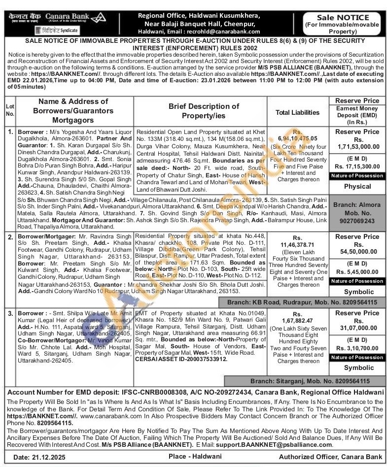 EMT of Property situated at Khata No.01049, Khasra No. 182/9 Min Ward No. 9, Patwari Gali Village Rampura, Tehsil Sitarganj, Distt. Udham Singh Nagar, Uttarakhand area measuring 66.91 Sq. mtr., Bounded as below:-North-Property of Sagar Mal, South House of Vendors, East Property of Sagar Mal, West-15ft. Wide Road. CERSAIASSET ID-200037533912.