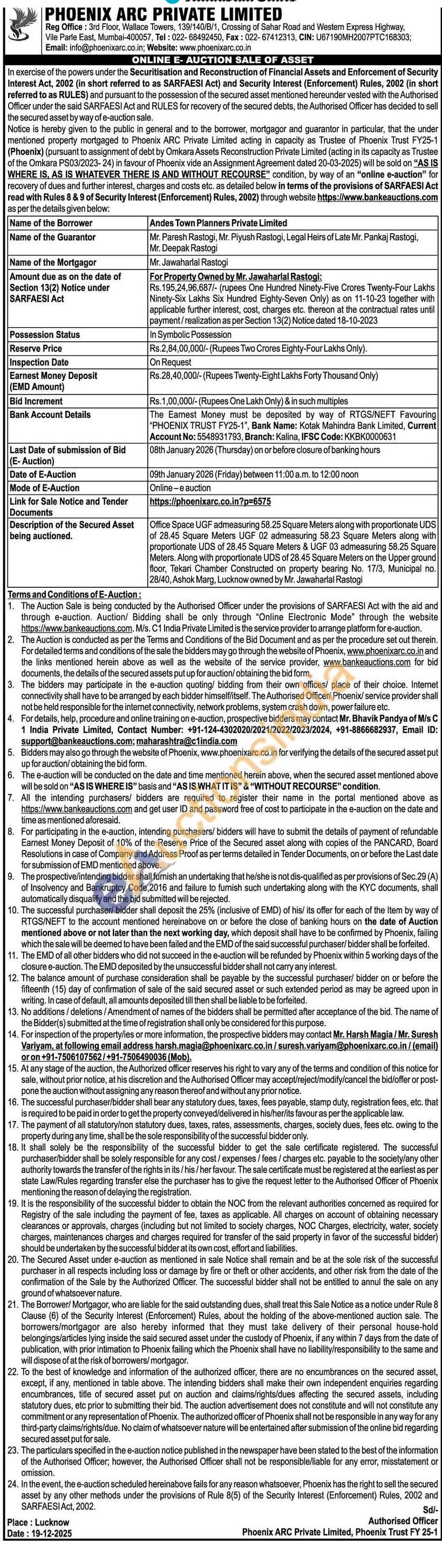 Office Space UGF admeasuring 58.25 Square Meters along with proportionate UDS of 28.45 Square Meters UGF 02 admeasuring 58.23 Square Meters along with proportionate UDS of 28.45 Square Meters & UGF 03 admeasuring 58.25 Square Meters. Along with proportionate UDS of 28.45 Square Meters on the Upper ground floor, Tekari Chamber Constructed on property bearing No. 17/3, Municipal no. 28/40, Ashok Marg, Lucknow owned by Mr. Jawaharlal Rastogi