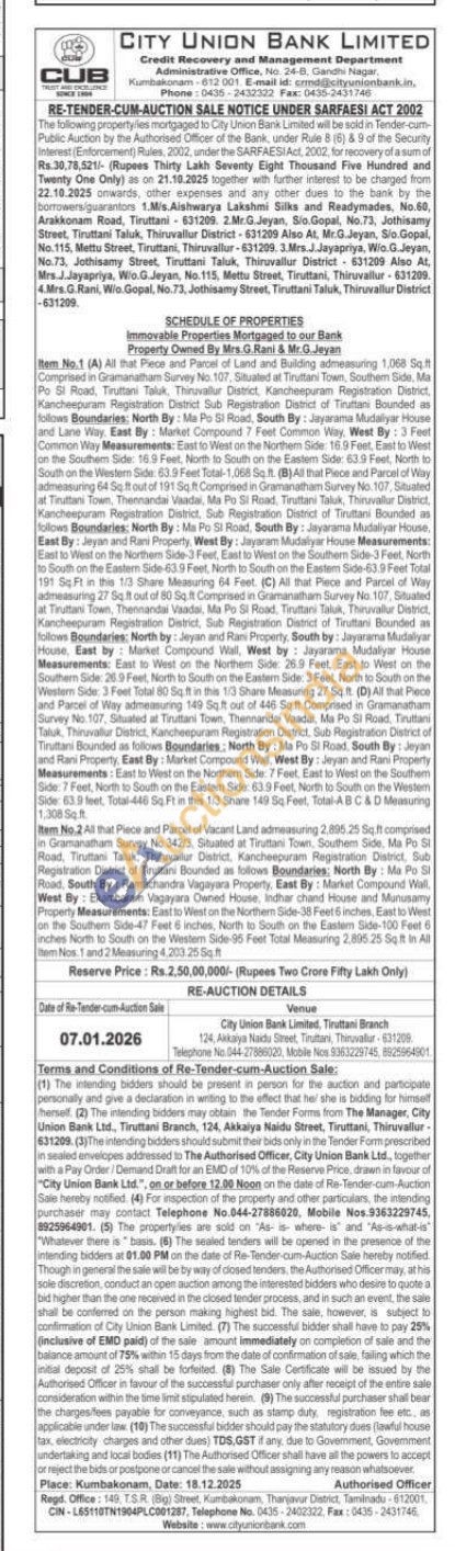 Item No.1 (A) All that Piece and Parcel of Land and Building admeasuring 1,068 Sq.ft Comprised in Gramanatham Survey No. 107, Situated at Tiruttani Town, Southem Side, Ma Po Si Road, Tiruttani Taluk, Thiruvallur District, Kancheepuram Registration District, Kancheepuram Registration District Sub Registration District of Tiruttani Bounded as follows Boundaries: North By: Ma Po Si Road, South By: Jayarama Mudallyar House and Lane Way, East By: Market Compound 7 Feet Common Way, West By: 3 Feet Common Way Measurements: East to West on the Northem Side: 16.9 Feet, East to West on the Southem Side: 16.9 Feet, North to South on the Eastem Side: 63.9 Feet, North to South on the Western Side: 63.9 Feet Total-1,068 Sq.ft. (B) All that Piece and Parcel of Way admeasuring 64 Sqft out of 191 Sq.ft Comprised in Gramanatham Survey No. 107, Situated at Tiruttani Town, Thennandai Vaadai, Ma Po Si Road, Tiruttani Taluk, Thiruvallur District, Kancheepuram Registration District, Sub Registration District of Tiruttani Bounded as follows Boundaries: North By: Ms Po SI Road, South By: Jayarama Mudaliyar House, East By: Jeyan and Rani Property, West By: Jayaram Mudalyar House