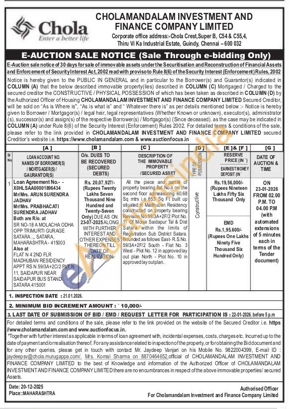 All the piece and parcel of property bearing flat No.4 on the second floor admeasuring 60.68 Sq mtrs ie 653 Sq Ft built up situated in Madhuban Residency constructed on property bearing Revision No.59/3A+2F/2 Plot No. 11 Of Mouje Saidapur Tal & Dist Satara within the limits of Registration Sub District Satara. Bounded as follows East- R.S.No. 59/3A+2F/2 South Flat No. 3 West-Plot No. 12 in approved lay out plan North Plot No. 10 in approved lay outplan.