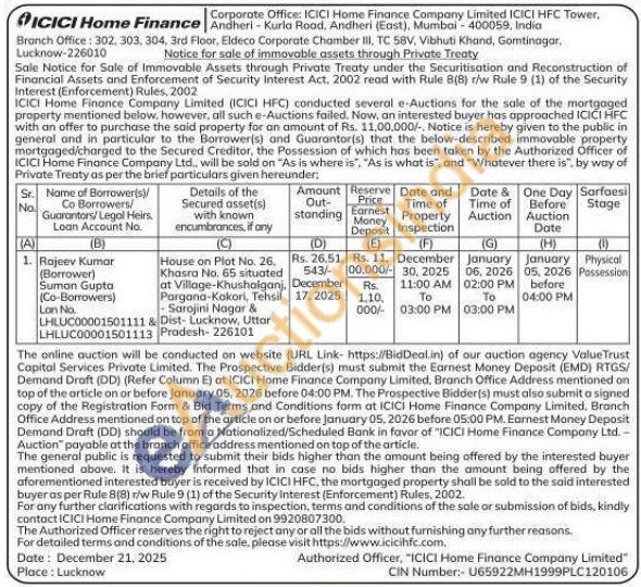 House on Plot No. 26. Khasra No. 65 situated at Village-Khushalganj, Pargana-Kakori, Tehsil Sarojini Nagar & Dist- Lucknow, Uttar Pradesh-226101