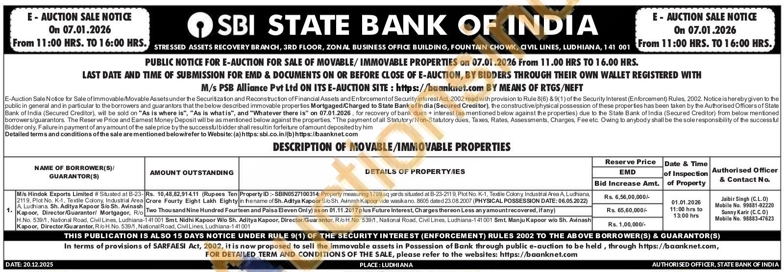 Property ID :- SBIN0527100314: Property measuring 1769 sq yards situated at B-23-211 9, Plot No. K-1, Textile Colony Industrial Area A, Ludhiana, in the name of Sh. Aditya Kapoor S/o Sh. Avinash Kapoor vide wasikano. 8605 dated 23.08.2007 (PHYSICAL POSSESSION DATE: 06.05.2022)