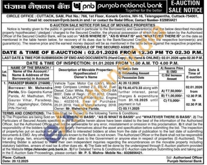 Vehicle Type: Motor Car (LMV), Model: Jeep Compass Limited 2.0, BS-IV, Fuel: Diesel, Color: White, Regn. No.: OD-02-BA 8007, Date of Regn 25.01.2019, Chasis No.: MCAAJPCY6JFA39183-8J, Engine No.: 4023016, Year of Purchase: 25.01.2019, Year of Manufacturing: 2018. Owner: Mr. Mahendra Parida.