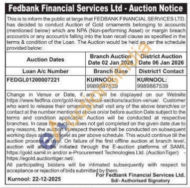 Fedbank Financial Services Ltd Gold Auctions Auction in Kurnool