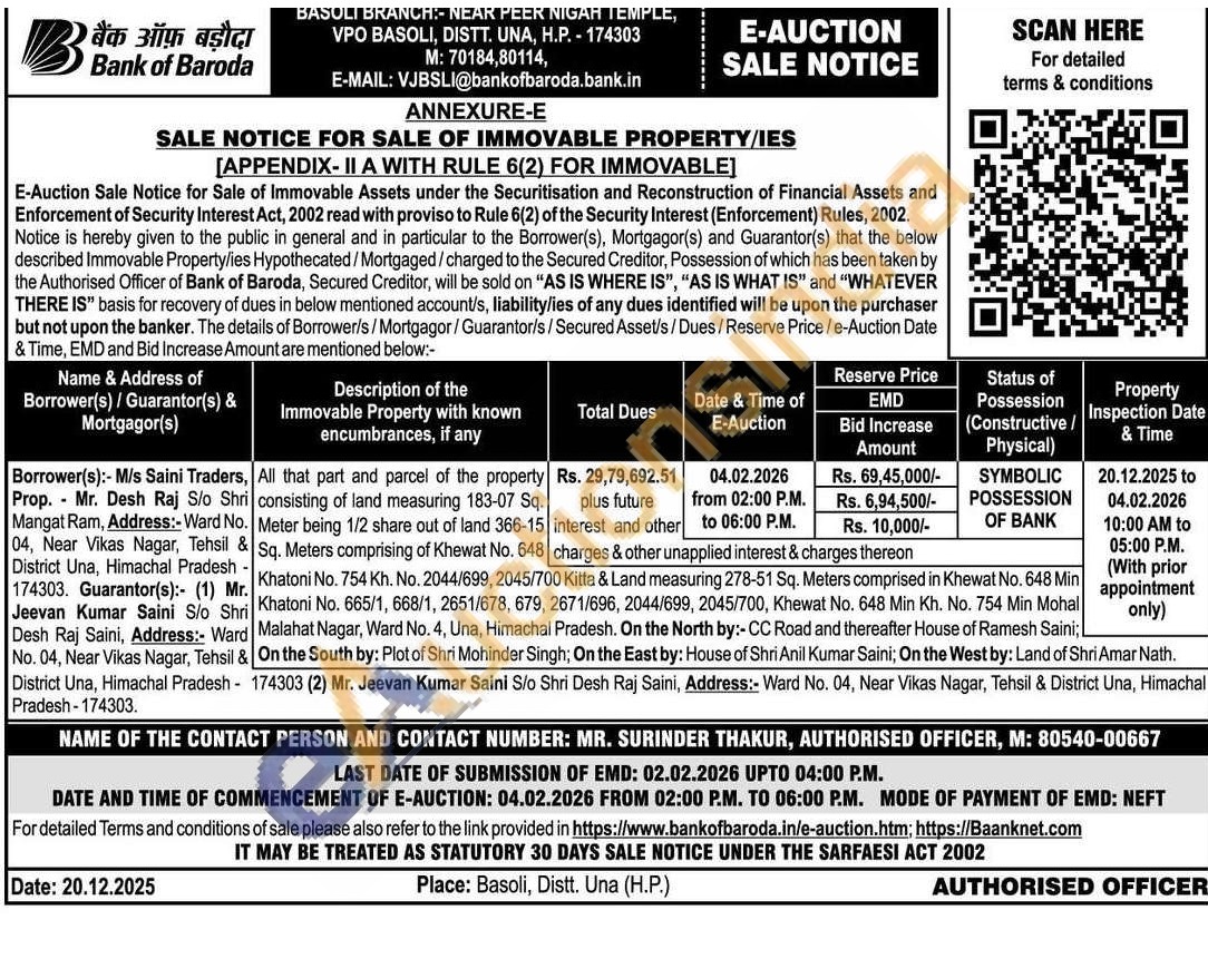 All that part and parcel of the property consisting of land measuring 183-07 Sq. Meter being 1/2 share out of land 366-15 Sq. Meters comprising of Khewat No. 648 Khatoni No. 754 Kh. No. 2044/699, 2045/700 Kitta & Land measuring 278-51 Sq. Meters comprised in Khewat No. 648 Min Khatoni No. 665/1, 668/1, 2651/678, 679, 2671/696, 2044/699, 2045/700, Khewat No. 648 Min Kh. No. 754 Min Mohal Malahat Nagar, Ward No. 4, Una, Himachal Pradesh. On the North by:- CC Road and thereafter House of Ramesh Saini on the South by: Plot of Shri Mohinder Singh; On the East by: House of Shri Anil Kumar Saini; On the West by: Land of Shri Amar Nath.
