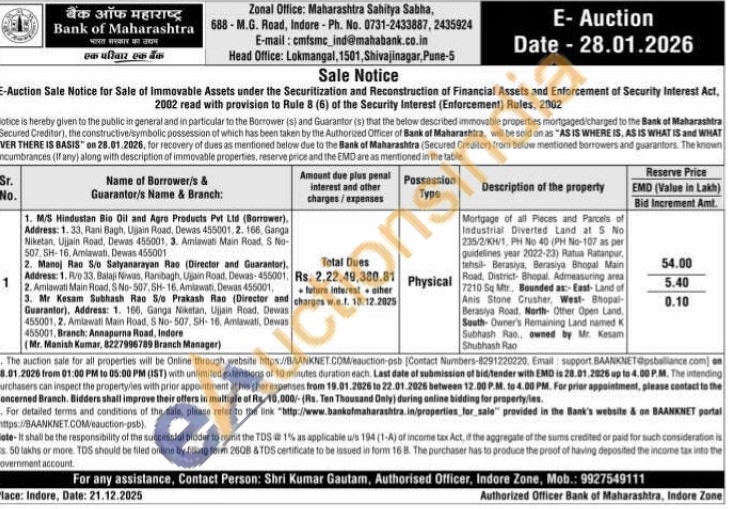 Mortgage of all Pieces and Parcels of Industrial Diverted Land at S No 235/2/KH/1, PH No 40 (PH No-107 as per guidelines year 2022-23) Ratua Ratanpur, tehsil- Berasiya, Berasiya Bhopal Main Road, District- Bhopal. Admeasuring area 7210 Sq Mtr., Bounded as: East-Land of Anis Stone Crusher, West Bhopal-Berasiya Road. North- Other Open Land, South-Owner's Remaining Land named K Subhash Rao., owned by Mr. Kesam Shubhash Rao