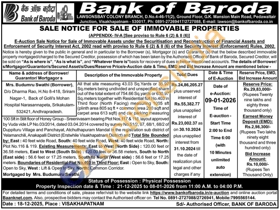 All that site measuring 43.03 Sq. Yards or 35.97 Sq.meters being undivided and unspecified share out of the total extent of 754.66 Sq.yards or 630.97 Sq.meters together with Residential flat No.403 in Third floor (North Facing) measuring 1005 sft (plinth area 805 sq ft + common area 200 sqft and carpet area 613 sqft) and car parking measuring 100 Sft in Stilt floor of Honey Group - Sreenivasam bearing Plot Nos. 117 & 118, layout approved by Vuda vide LP No.03/2014, dated 03.04.2014 covered by survey No.51/2, 67, 68/1, 68/2 of Duppituru Village and Panchayat, Atchuthapuram Mandal in the registration sub district of Yelamanchili, Anakapalli District (Erstwhile Visakhapatnam District) and Total Site Bounded by: East: 40 feet wide Road, South: 40 feet wide Road, West: 40 feet wide Road, North: Plot No.116 & 119. Existing Measurements: East to West (North Side): 120.00 feet or 36.58 meters, East to West (South Side): 120.00 feet or 36.58 meters, South to North (East side): 56.6 feet or 17.25 meters, South to North (West side): 56.6 feet or 17.25 meters. Boundaries of Residential Flat No.403 in Third Floor: East: Open to Sky, South: Open to Sky, West: Lift & Open to Sky, North: Common Corridor. Mortgaged by Mrs. Budumuru Swathi