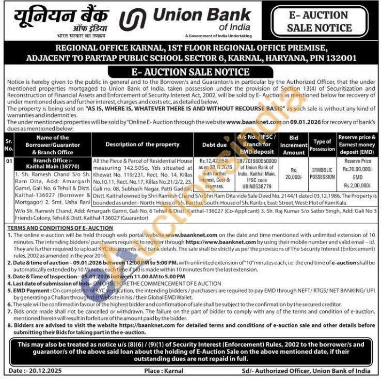 All the Piece & Parcel of Residential House measuring 142.505q. Yds situated at Khewat No. 119/231, Rect. No. 14, Killas No.10,11, Rect. No.17, Killas No.21/2/2, 25, Gali no. 08, Subhash Nagar, Patti GaddarDistt. Kaithal owned by Shri Ramesh Chand S/o Shri Ram Dita vide Sale Deed No. 2144/1 dated 03.12.1986. The Property is bounded as under:- North: House of Sh. Barthu, South: House of Sh. Ranbir, East: Street, West: Plot of Ram Kala