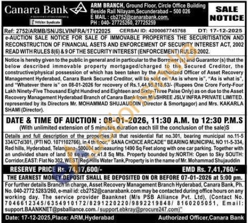 Details and full description of the properties: All that residential flat no.301, bearing municipal no.11-5 334/C7d/301, (PTI NO. 1071102766), in 4 th floor," SANA CHOICE ARCADE BEARING MUNICIPAL NO 11-5-334, Red hills, Hyderabad, Telangana-500004 admeasuring 1490 Sq Feet along with one car parking. Together with an undivided share of land 50 sq yds or 41.8 Sq Mts. Property bounded by:NORTH: Open to Sky SOUTH: Corridor, EAST: Flat No 302, WEST: Red Hills Water Tank, Property is in the name of Mr. Mohammad Shujauddin