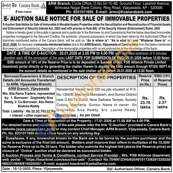 Residential Vacant land 220 sq.yds situated at R.S. No. 1350/B, Macherla Mandalam, and Guntur District near D.No.14-2-243, Near Saibaba Temple, Society Colony, Macherla, Guntur. Name of owner Sri Gogireddy Siva Reddy, S/o. Laxma Reddy. Boundaries: As per Deed.