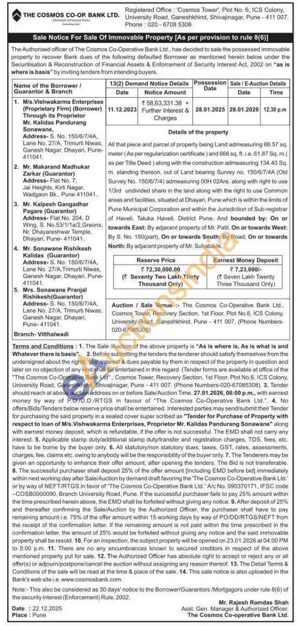 Details of the property : All that piece and parcel of property being Land admeasuring 66.57 sq. meter (As per regularization certificate) and 666 sq. ft. i.e. 61.87 Sq. m.( as per Title Deed) along with the construction admeasuring 134.40 Sq. m. standing thereon, out of Land bearing Survey no. 150/6/7/4A (Old Survey No. 150/6/7/4) admeasuring 00H 02Are, along with right to use 1/3rd undivided share in the land along with the right to use Common areas and facilities, situated at Dhayari, Pune which is within the limits of Pune Municipal Corporation and within the Jurisdiction of Sub-registrar of Haveli, Taluka Haveli, District Pune. And bounded by: On or towards East: By adjacent property of Mr. Patil, On or towards West: By S. No. 150(part), On or towards South: By Road, On or towards North: By adjacent property of Mr. Suhabade