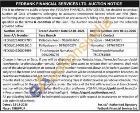 Fedbank Financial Services Ltd Gold Auctions Auction in Tiruppur