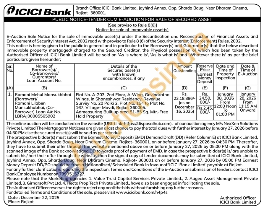 Flat No. A-203, 2nd Floor, A-Wing, Govindratna Wings, in Shaneshwar Residency, Revenue Survey No. 20 Paiki 2, Plot No. 154 to Plot No. 167, Village- Mavdi, Rajkot 360005. Admeasuring Built up area 51-85 Sq. Mtr.-Free Hold Property