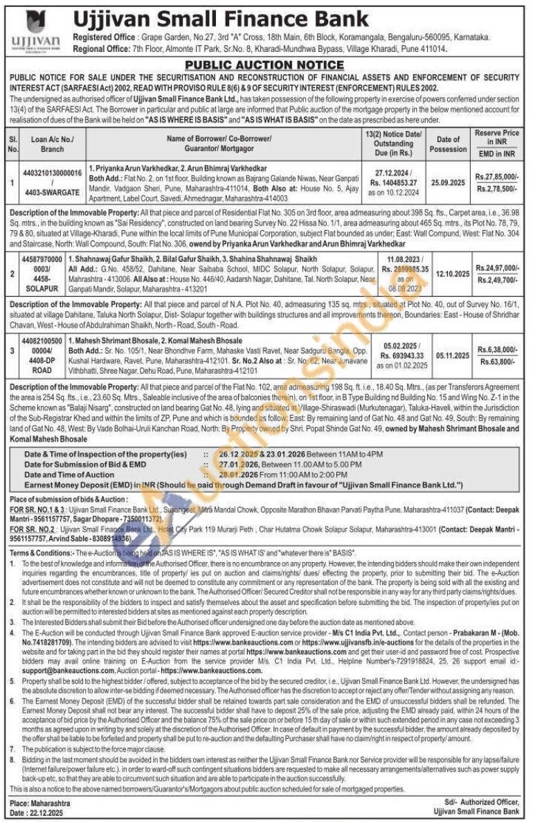 Description of the Immovable Property: All that piece and parcel of Residential Flat No. 305 on 3rd floor, area admeasuring about 398 Sq. fts., Carpet area, i.e., 36.98 Sq. mtrs., in the building known as "Sai Residency", constructed on land bearing Survey No. 22 Hissa No. 1/1, area admeasuring about 465 Sq. mtrs., its Plot No. 78, 79, 79 & 80, situated at Village-Kharadi, Pune within the local limits of Pune Municipal Corporation, subject Flat bounded as under, East: Wall Compund, West: Flat No. 304 and Staircase, North: Wall Compound, South: Flat No. 306, owend by Priyanka Arun Varkhedkar and Arun Bhimraj Varkhedkar