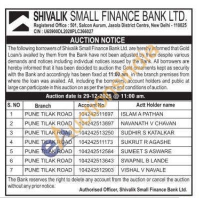 Shivalik Small Finance Bank Ltd Gold Auctions Auction in Pune