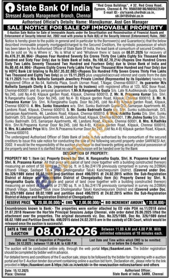 DESCRIPTION OF PROPERTY: PROPERTY NO 1: Item (a): Property Owned by: Shri. N. Ranganatha Gupta, Shri. N. Prapanna Kumar and Shri. N. Prasanna Kumar. All that piece and parcel of land (now together with a building constructed thereon) measuring an extent of 50 cents or 21780 sq. ft. in S.No.2/417B previously comprised in survey no.2/286A) Uthandi Village, Saidapet Taluk (now Sholinganallur Taluk) Kancheepuram District. (Covered under Doc. No.326/1989 dated 08.02.1989 and partition deed 496/2015 dt 24.02.2015 within the Sub-Registration District of Adayar and Registration District of Chengalpattu) Item (b): Property Owned by: Shri. N. Ranganatha Gupta. All that piece and parcel of land (now together with a building constructed thereon) measuring an extent of 50 cents or 21780 sq. ft. in S.No.2/417B previously comprised in survey no.2/286A) Uthandi Village, Saidapet Taluk (now Sholinganallur Taluk) Kancheepuram District and (Covered under Doc. No.325/1989 dated 08.02.1989 and partition deed 496/2015 dt 24.02.2015 within the Sub-Registration District of Adayar and Registration District of Chengalpattu)