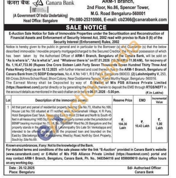 All that part and parcel of residential property bearing Site No.70, Khatha No. 166, House List No.193 situated at ITI notified area, Kowdanahalli Village, KR Pura, Hobli Bangalore East Taluk, measuring East to West 33 feet and North to South 45 feet in all measuring 1485 Sq.ft and now the property comes under the jurisdiction of BBMP bearing municipal No.70, HL, No. 166 BBMP Ward No.26 Bangalore and the property stands in the name of Mr. V. Lakshmipathy Sio Late Sri Venkatappa and intended to be offered as security to the proposed loan and bounded on the: East by: Site belongs to Smt. Kamalamma, West by: Road, North by: Govt. Property, South by: Site No.69.