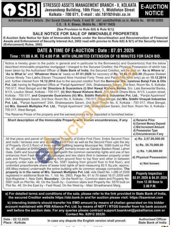 All that piece and parcel of Commercial Property of Entire First Floor, Entire Second Floor and roofs/terraces over and above the First Floor as well as the Second Floor upto the sky of Property (G+2.5 floor) of three storied building bearing Municipal No. 5580 build on Plot No. 47, situated at SHRADHANAND MARG, formerly known as Garston Bastion Road, Lahori Gate. Delhi and bounded as below, alongwith the common ownership rights and use of two entrances from Fasil Road side, passages and two stairs (first in between property under sale and Property No. 5579 leading from ground floor to top floor and other in between property under sale and Property No. 5581 leading from ground floor to first floor), and undivided proportionate share of lease hold rights of land measuring 82.5 Sq.yds. approx. (68.98sq.meters) underneath the entire building with its common sewage connection. The property is in the name of Mis. Ganesh Multiplex Pvt. Ltd. vide Deed No. 1-286 of 2009 registered in additional Book No. 1, Vol. No. 2803, Page No. 61 to 70 dated 16.01.2009 with Sub-Registrar-1, New Delhi. Boundary: On the North by Common stairs and Property No. 5581 built on Plot No. 46, On the South by Common stairs and Property No. 5579 built on Plot No. 48, On the East by - Fasil Road, On the West by-Main Shradhanand Marg