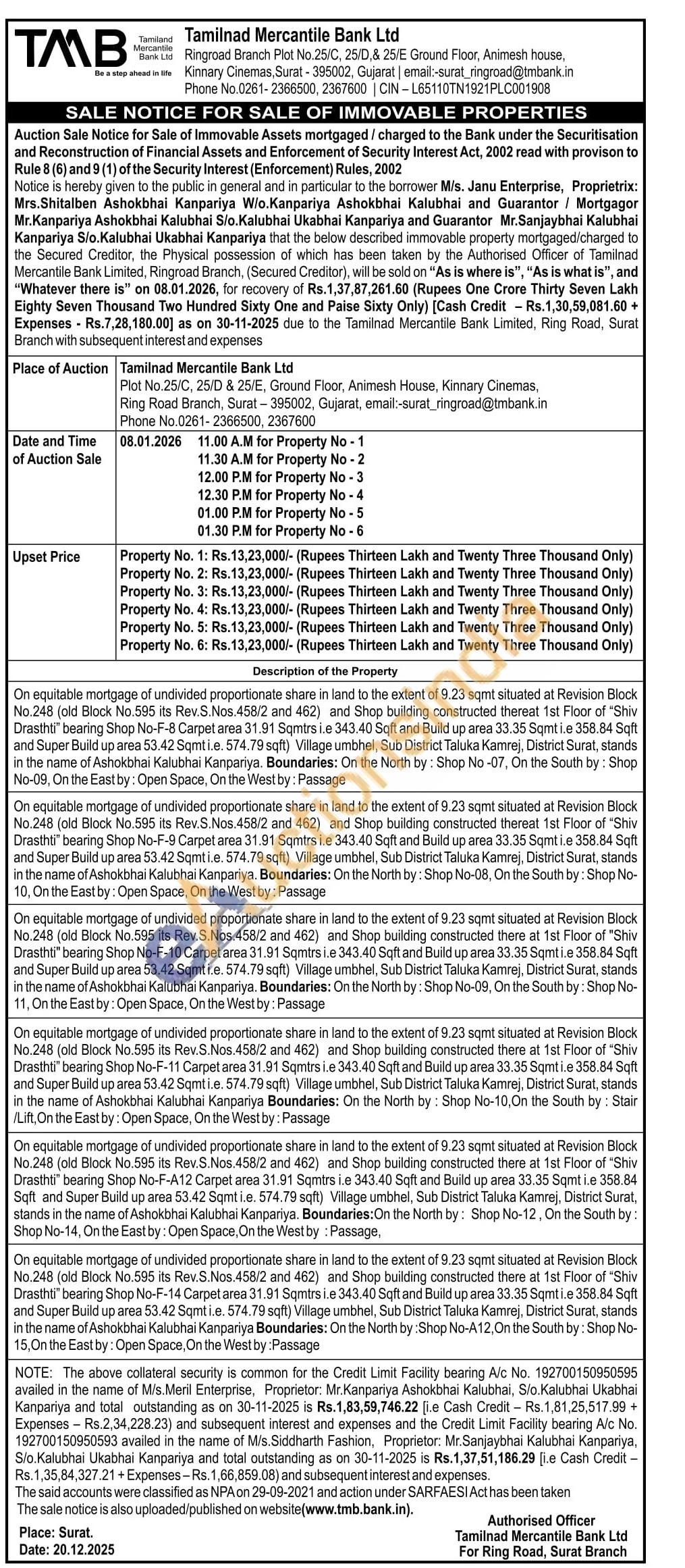 On equitable mortgage of undivided proportionate share in land to the extent of 9.23 samt situated at Revision Block No.248 (akd Block No.595 its Rev.S. Nos 458/2 and 462) and Shop building constructed there at 1st Floor of "Shiv Drasthti bearing Shop No-F-11 Carpet area 31.91 Sqmirsi e 343.40 Sqft and Build up area 33.35 Sqmtie 358.84 Sqft and Super Build up area 53.42 Sqmti.e. 574,79 sqft) Vilage umbhel, Sub District Taluka Kamrej, District Surat, stands in the name of Ashokbhai Kalubhai Kanpariya Boundaries: On the North by: Shop No-10. On the South by: Stair Lift, On the East by: Open Space, On the Westby: Passage