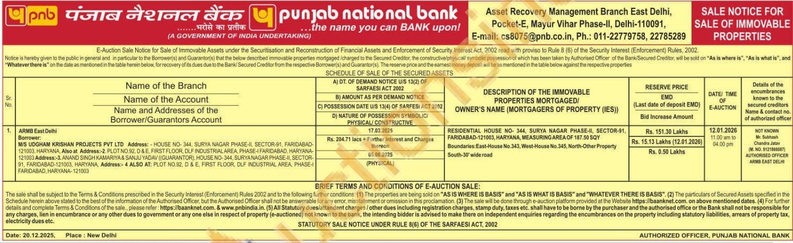 RESIDENTIAL HOUSE NO-344, SURYA NAGAR PHASE-II, SECTOR-91, FARIDABAD-121003, HARYANA, MEASURING AREA OF 187.50 SQY Boundaries:East-House No.343, West-House No.345, North-Other Property South-30' wide road