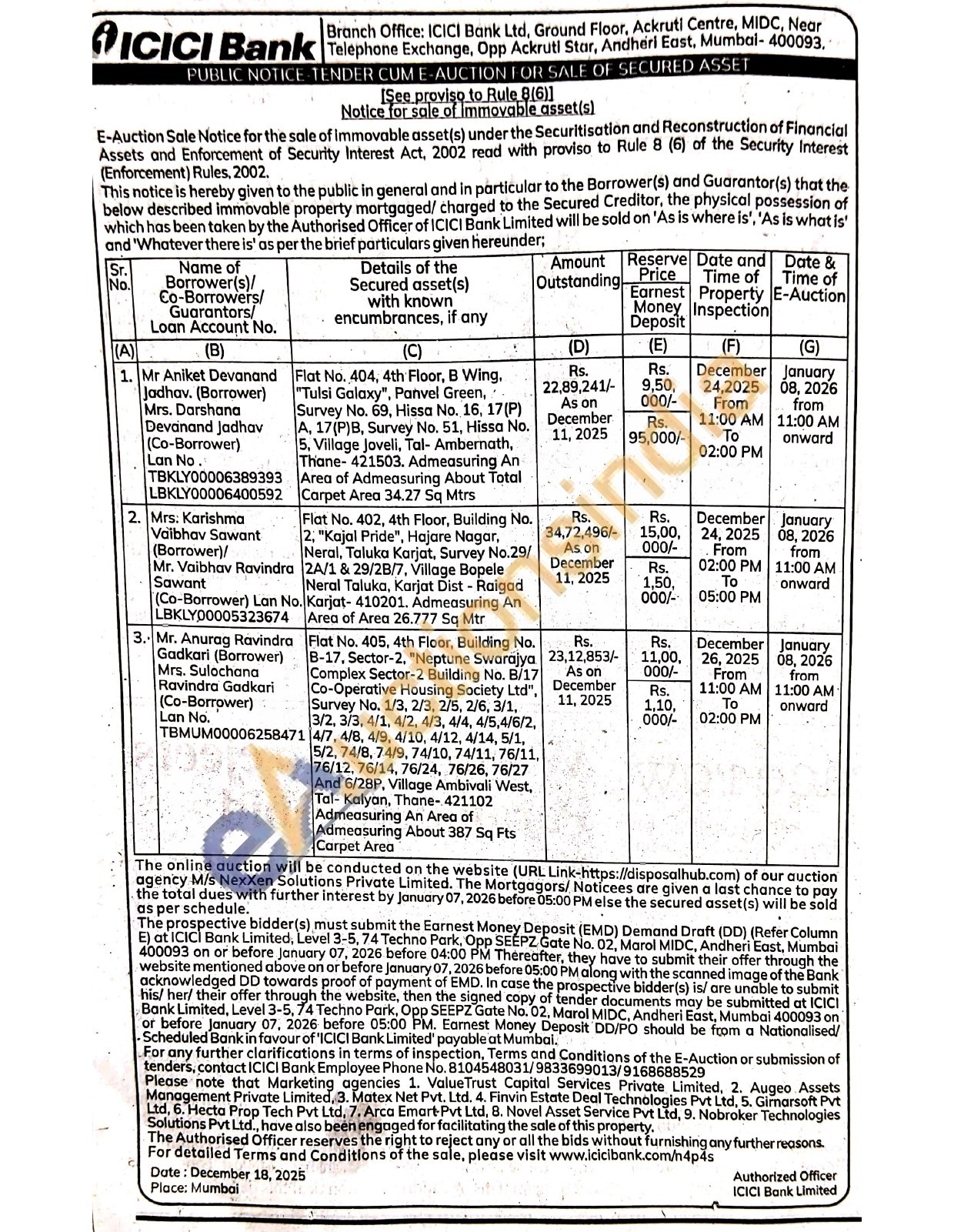 Flat No. 405, 4th Floor, Building No. B-17, Sector-2, "Neptune Swarajya Complex Sector-2 Building No. B/17 Co-Operative Housing Society Ltd", Survey No. 1/3, 2/3, 2/5, 2/6, 3/1, 3/2, 3/3, 4/1, 4/2, 4/3, 4/4, 4/5,4/6/2, 4/7, 4/8, 4/9, 4/10, 4/12, 4/14, 5/1, 5/2, 74/8, 74/9, 74/10, 74/11, 76/11, 76/12, 76/14, 76/24, 76/26, 76/27 And 6/28P, Village Ambivali West, Tal-Kalyan, Thane-421102 Admeasuring An Area of Admeasuring About 387 Sq Fts Carpet Area