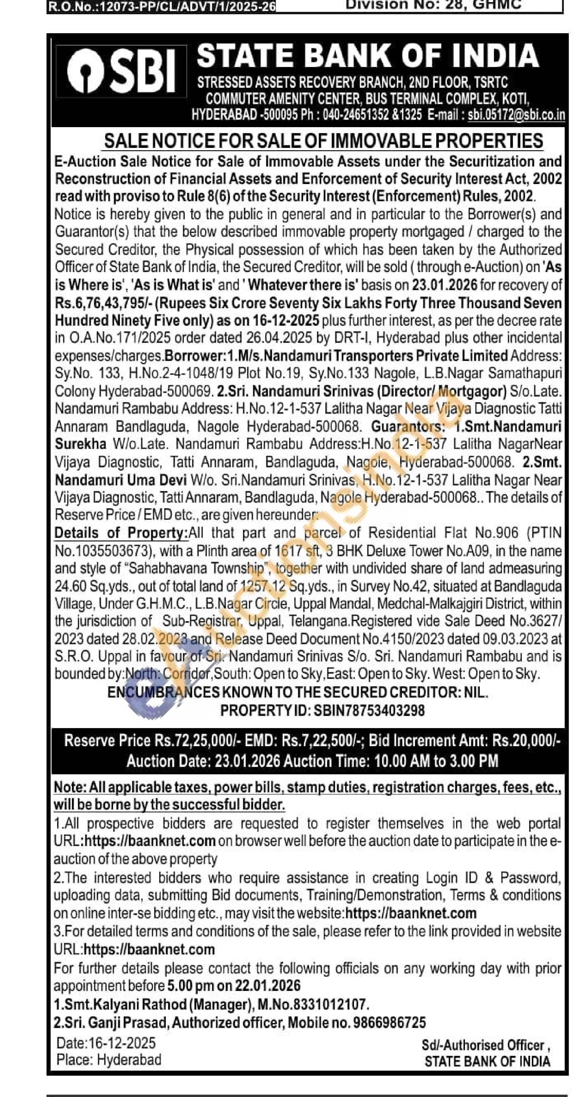 All that part and parcel of Residential Flat No.906 (PTIN No.1035503673), with a Plinth area of 1617 sft, 3 BHK Deluxe Tower No.A09, in the name and style of "Sahabhavana Township", together with undivided share of land admeasuring 24.60 Sq.yds., out of total land of 1257.12 Sq.yds., in Survey No.42, situated at Bandlaguda Village, Under G.H.M.C., L.B.Nagar Circle, Uppal Mandal, Medchal-Malkajgiri District, within the jurisdiction of Sub-Registrar, Uppal, Telangana. Registered vide Sale Deed No.3627/2023 dated 28.02.2023 and Release Deed Document No.4150/2023 dated 09.03.2023 at S.R.O. Uppal in favour of Sri. Nandamuri Srinivas S/o. Sri. Nandamuri Rambabu and is bounded by:North: Corridor, South: Open to Sky, East: Open to Sky. West: Open to Sky.