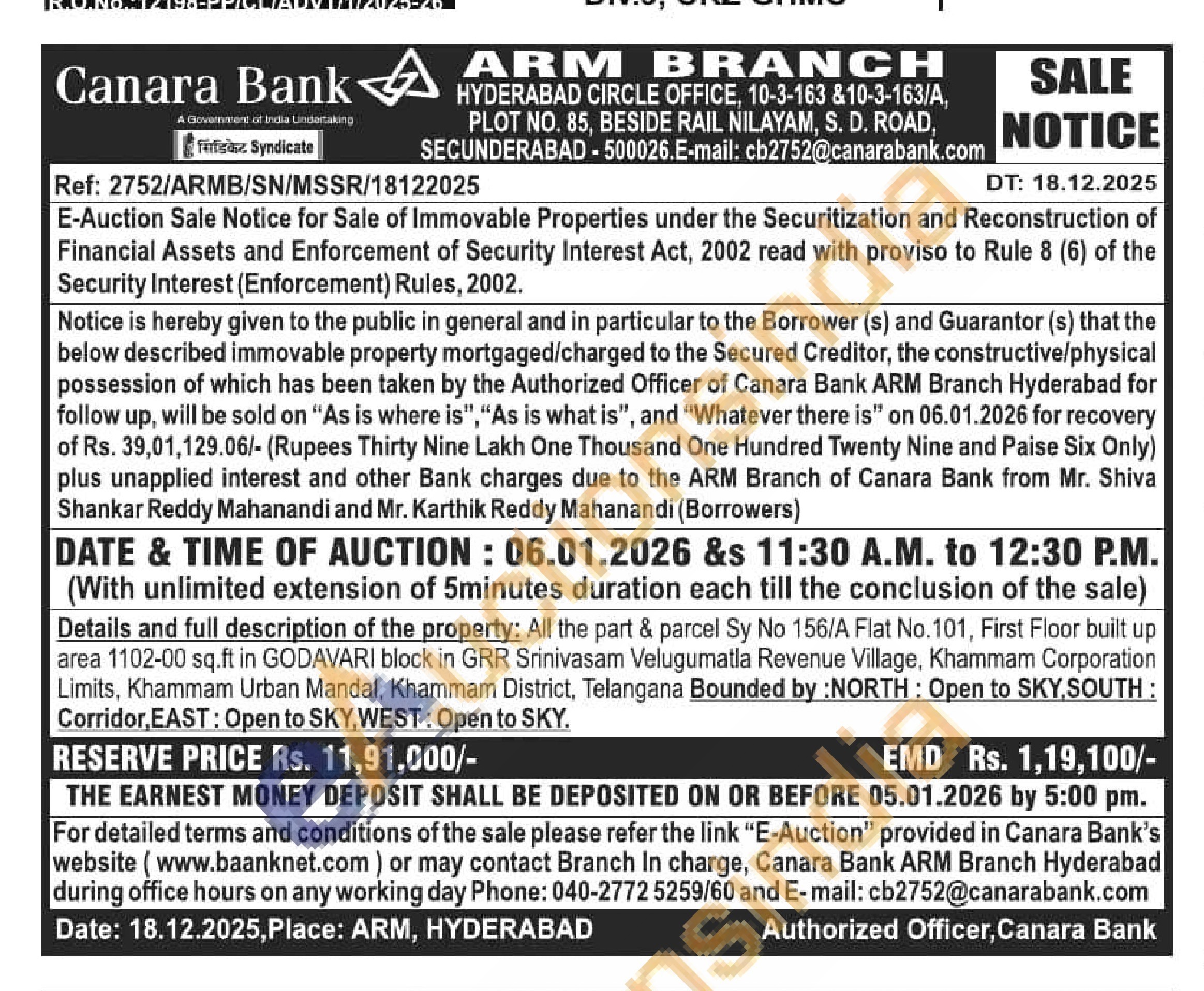 All the part & parcel Sy No 156/A Fiat No. 101, First Floor built up area 1102-00 sq.ft in GODAVARI block in GRR Srinivasam Velugumatla Revenue Village, Khammam Corporation Limits, Khammam Urban Mandal, Khammam District, Telangana Bounded by: NORTH: Open to SKY, SOUTH: Corridor, EAST: Open to SKY, WEST: Open to SKY.