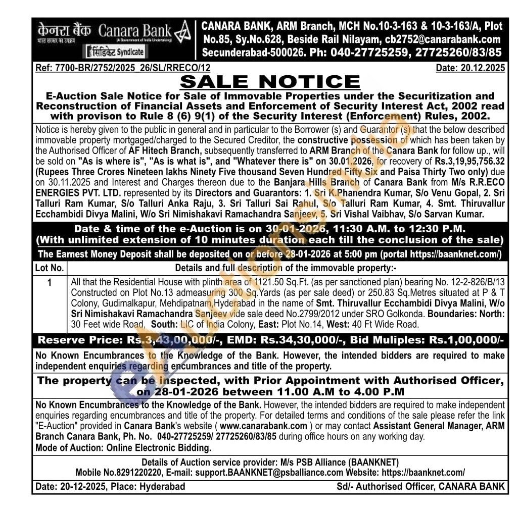 All that the Residential House with plinth area of 1121.50 Sq. Ft. (as per sanctioned plan) bearing No. 12-2-826/B/13 Constructed on Plot No.13 admeasuring 300 Sq. Yards (as per sale deed) or 250.83 Sq.Metres situated at P & T Colony, Gudimalkapur, Mehdipatnam, Hyderabad in the name of Smt. Thiruvallur Ecchambidi Divya Malini, W/o Sri Nimishakavi Ramachandra Sanjeev vide sale deed No.2799/2012 under SRO Golkonda. Boundaries: North: 30 Feet wide Road, South: LIC of India Colony, East: Plot No. 14, West: 40 Ft Wide Road.