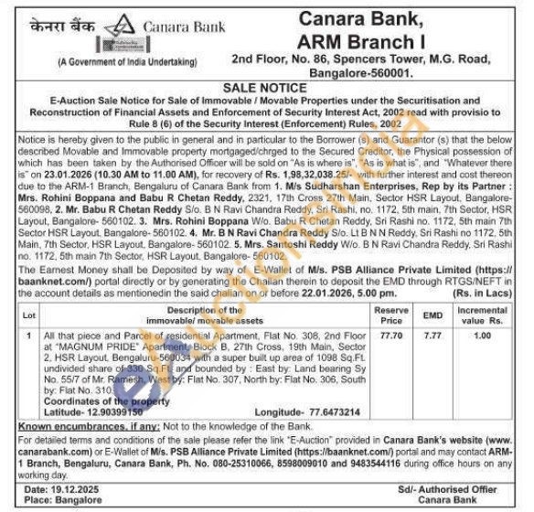 All that piece and Parcel of residential Apartment, Flat No. 308, 2nd Floor at "MAGNUM PRIDE Apartment, Block B, 27th Cross, 19th Main, Sector 2. HSR Layout Bengaluru-560034 with a super built up area of 1098 Sq.FL undivided share of 330 Sq. Ft. and bounded by: East by Land bearing Sy No. 55/7 of Mr. Ramesh, West by: Flat No. 307, North by: Flat No. 306, South by: Fiat No. 310