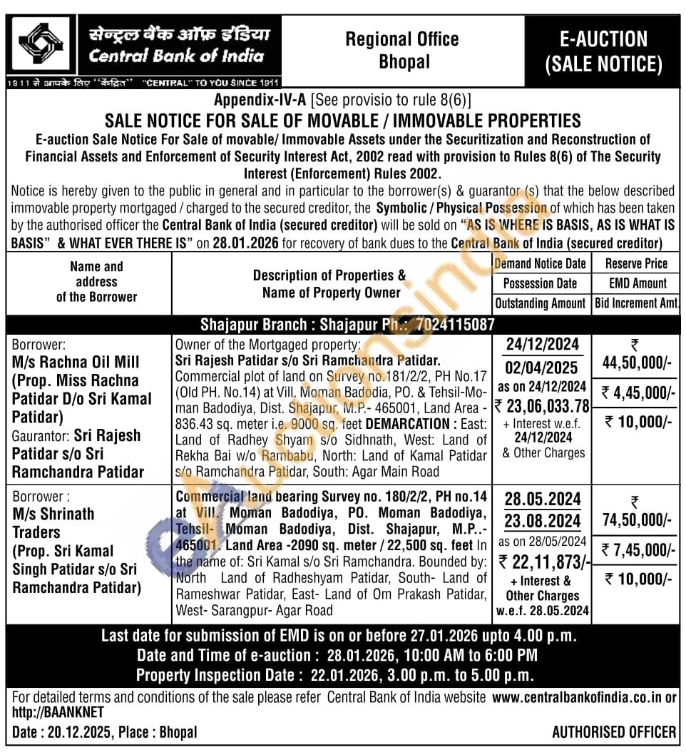 Commercial land bearing Survey no. 180/2/2, РН по.14 at Vill. Moman Badodiya, PO. Moman Badodiya, Tehsil- Moman Badodiya, Dist. Shajapur, M.P..-465001. Land Area -2090 sq. meter/22,500 sq. feet In the name of: Sri Kamal s/o Sri Ramchandra. Bounded by: North Land of Radheshyam Patidar, South- Land of Rameshwar Patidar, East- Land of Om Prakash Patidar, West-Sarangpur- Agar Road