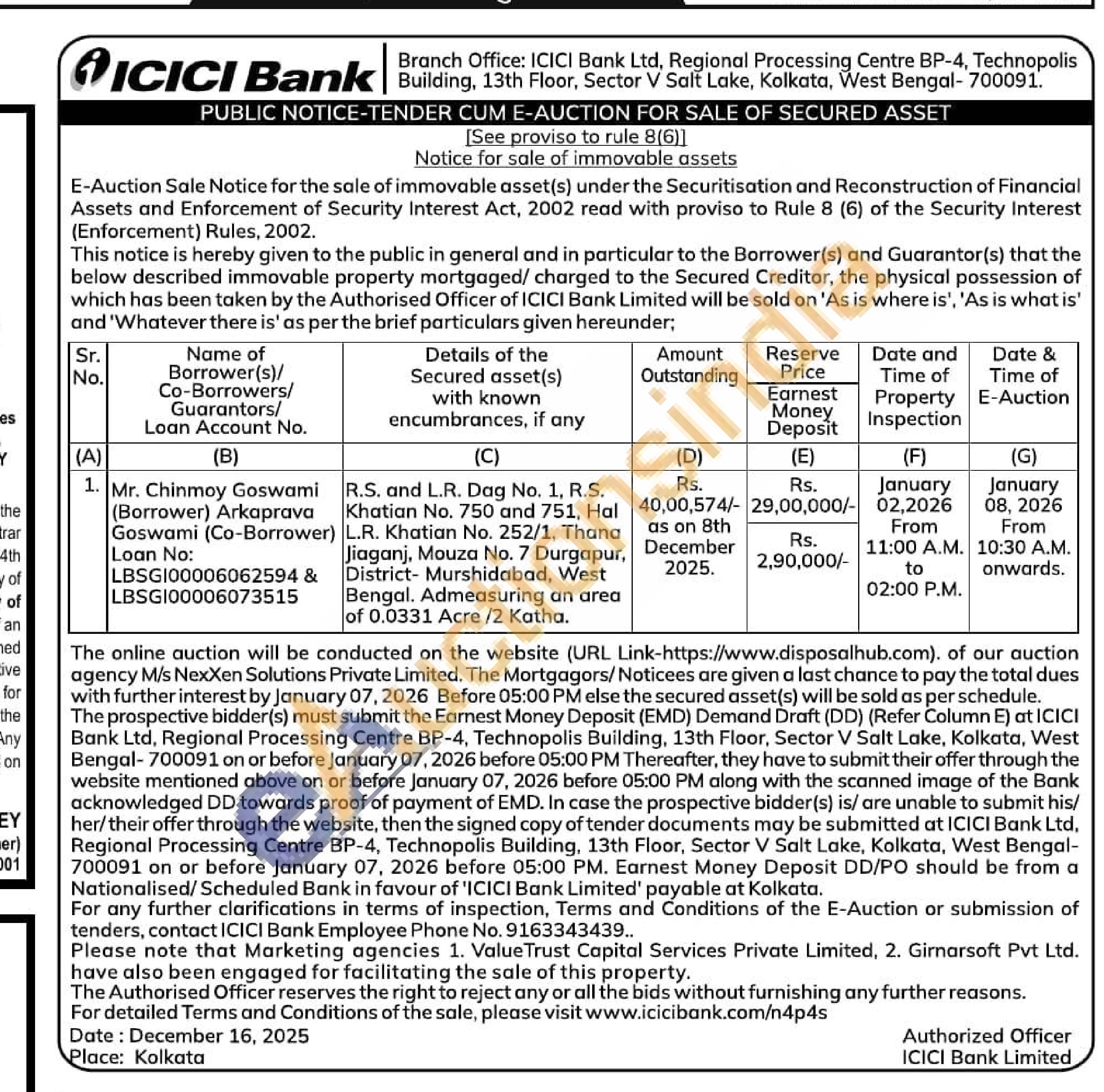 R.S. and L.R. Dag No. 1, R.S. Khatian No. 750 and 751, Hal L.R. Khatian No. 252/1, Thana Jiaganj, Mouza No. 7 Durgapur, District- Murshidabad, West Bengal. Admeasuring an area of 0.0331 Acre /2 Katha.