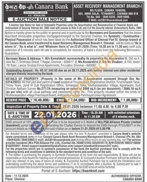 DETAILS OF PROPERTY: (Property in the name of Ms. V.Anuvarshini conveyed through Doc No: 5314/2023): All that part and parcel of Land located at Tiruchirapalli Registration District, Tiruchirapalli Taluk, Trichy Town, Joint III Sub Registration Office, Srirangam Taluk, Mutharasanallur Village, Agraharam, Sub Division Natham Survey No.277/7A measuring an extent of 3999 sq.ft (as per document)/3846.10 sq.ft (as per site) with all usual pathway and easements rights etc., This property situated within the limits of Mutharasanallur village Panchayat Board, Anthanallur village Panchayat Union Agraharam.