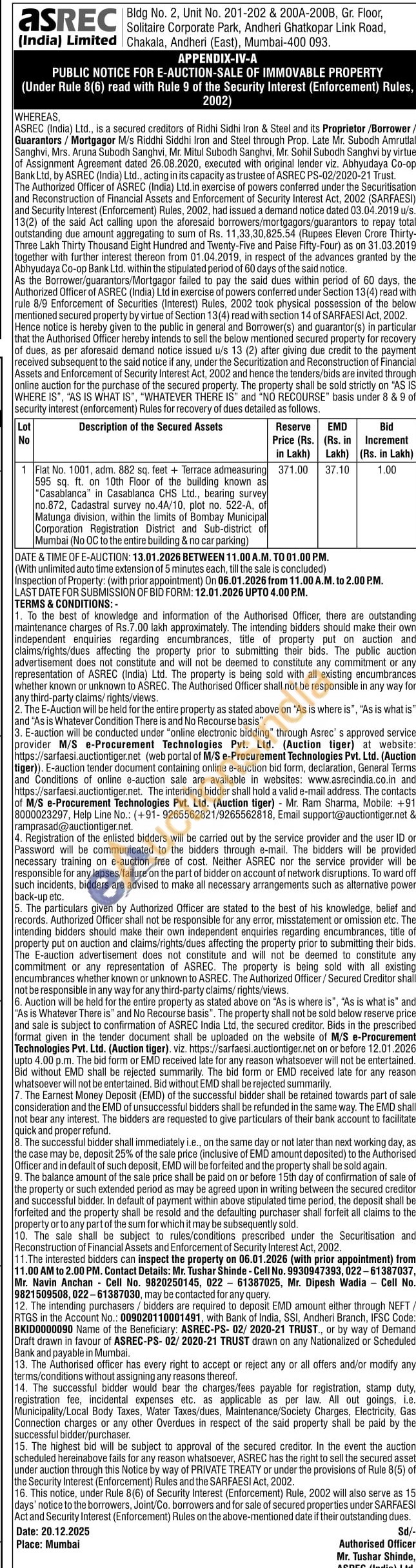 Flat No. 1001, adm. 882 sq. feet + Terrace admeasuring 595 sq. ft. on 10th Floor of the building known as "Casablanca" in Casablanca CHS Ltd., bearing survey no.872, Cadastral survey no.4A/10, plot no. 522-A, of Matunga division, within the limits of Bombay Municipal Corporation Registration District and Sub-district of Mumbai (No OC to the entire building & no car parking)