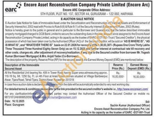 Al the Residential Unit bearing No. 406 in Tower Rose having Super area admeasuring approx. 116-16 Sq. Mt. 1250 Sq. Ft. on 4th Floor at Aries Green Homes situated at Vilage Banbeerpur, Alwar, Tijara Road, Tehsil Tijara District Alwar Rajasthan-301019