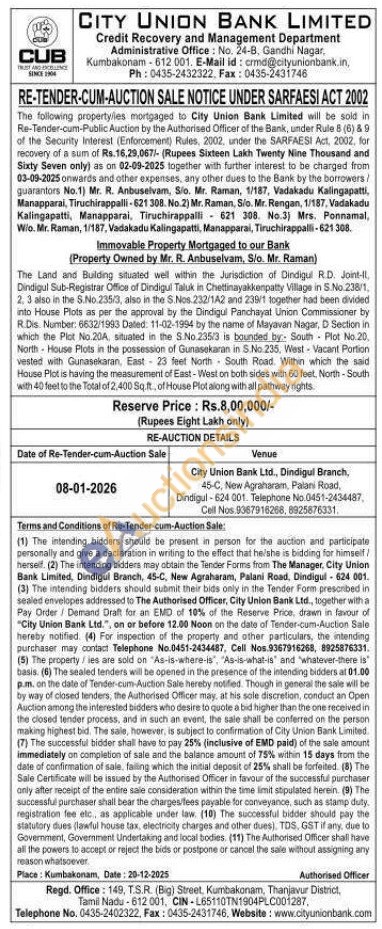 Immovable Property Mortgaged to our Bank (Property Owned by Mr. R. Anbuselvam, S/o. Mr. Raman) : The Land and Building situated well within the Jurisdiction of Dindigul R.D. Joint-IL, Dindigul Sub-Registrar Office of Dindigul Taluk in Chettinayakkenpatty Village in S.No.238/1, 2. 3 also in the S.No.235/3, also in the S.Nos 232/1A2 and 239/1 together had been divided into House Plots as per the approval by the Dindigul Panchayat Union Commissioner by R.Dis. Number: 6632/1993 Dated: 11-02-1994 by the name of Mayavan Nagar, D Section in which the Plot No.20A, situated in the S.No.235/3 is bounded by: South Plot No.20, North House Plots in the possession of Gunasekaran in S.No.235, West Vacant Portion vested with Gunasekaran, East 23 feet North South Road. Within which the said House Plot is having the measurement of East-West on both sides with 60 feet, North-South with 40 feet to the Total of 2,400 Sq.ft., of House Plot along with all pathway rights