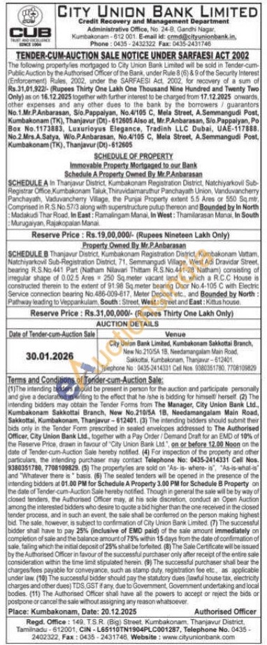 Schedule A Property Owned By Mr.P.Anbarasan : SCHEDULE A In Thanjavur District, Kumbakonam Registration District, Natchiyarkovil Sub-Registrar Office, Kumbakonam Taluk, Thiruvidaimaruthur Panchayath Union, Vanduvancherry Panchayath, Vaduvancherry Village, the Punjai Property extent 5.5 Ares or 550 Sq.mtr, Comprised in R.S.No. 57/3 along with superstructure putup thereon and Bounded by In North Madakudi Thar Road, In East: Ramalingam Manai, In West: Thamilarasan Manai, In South Murugaiyan, Rajakopalan Manai