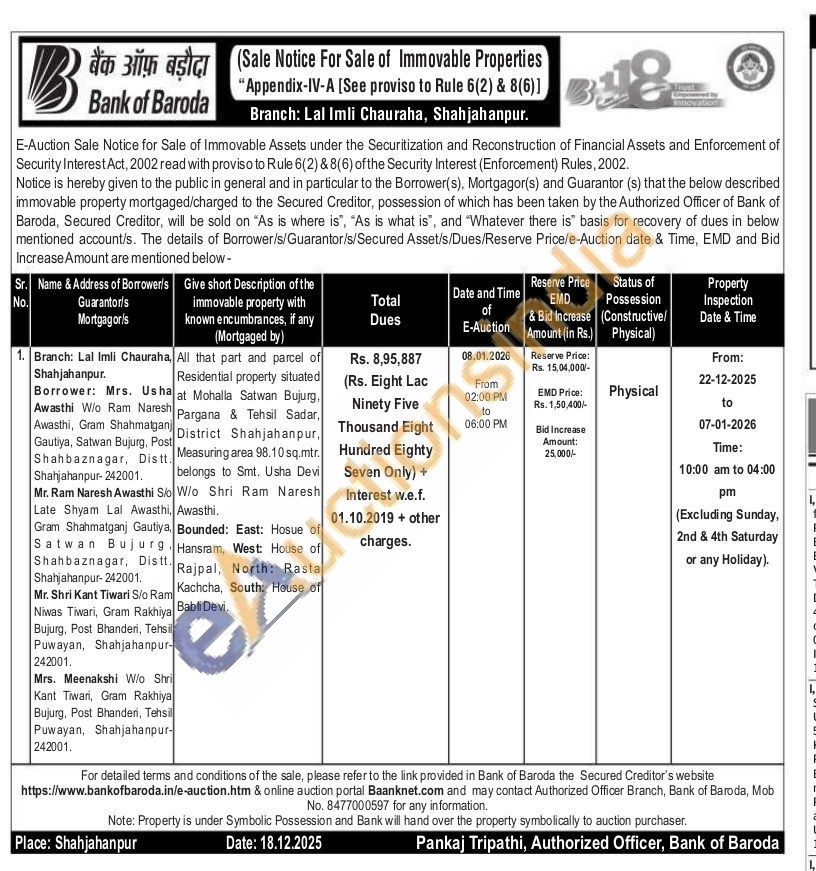 All that part and parcel of Residential property situated at Mohalla Satwan Bujurg, Pargana & Tehsil Sadar, District Shahjahanpur, Measuring area 98.10 sq.mtr. belongs to Smt. Usha Devi W/o Shri Ram Naresh Awasthi.Bounded: East: Hosue of Hansram, West: House of Rajpal, North: Rasta Kachcha, South: House of Babli Devi.
