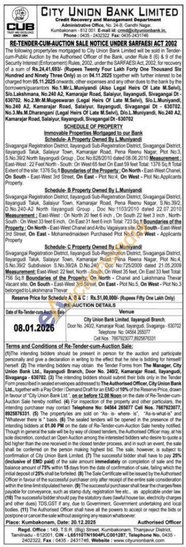 Schedule- B Property Owned By L.Muniyandi Sivagangal Registration District, Ilayangudi Sub-Registration District, Sivagangai District, Ilayangudi Taluk, Salalyur Town, Kamarajar Road, Pena Reenu Nagar, S.No.39/2, D.No.240-A2 North Ilayangudi Group, Doc No: 1103/2010 dated 22.07.2010 Measurement; East-West: On North 20 feet 6 inch, On South 22 feet 3 inch, North-South: On West 33 feet 6 inch, On East 31 feet 6 inch Total: 723 Sq.ft Boundaries of the Property: On North-East-West Chanel and Aribu Vagaiyara site, On South-East-West 3rd Street, On East-Mohamedmaideen Purchased Plot No.6, On West- Applicants Property