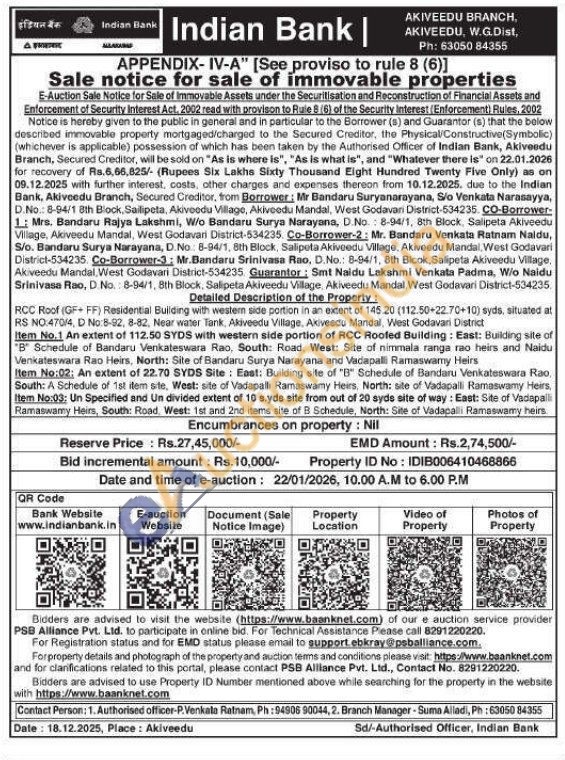 RCC Roof (GF+ FF) Residential Building with western side portion in an extent of 145.20 (112.50-22.70+10) syds, situated at RS NO:470/4, D No:8-92, 8-82, Near water Tank, Akiveedu Village, Akiveedu Mandal, West Godavari District Item No.1 An extent of 112.50 SYDS with western side portion of RCC Roofed Building: East: Building site of "B" Schedule of Bandaru Venkateswara Rao, South: Road, West: Site of nimmala ranga rao heirs and Naidu Venkateswara Rao Heirs, North: Site of Bandaru Surya Narayana and Vadapalli Ramaswamy Heirs Item No:02: An extent of 22.70 SYDS Site: East: Building site of "B" Schedule of Bandaru Venkateswara Rao. South: A Schedule of 1st item site, West: site of Vadapalli Ramaswamy Heirs. North: site of Vadapalli Ramaswamy Heirs, Item No:03: Un Specified and Un divided extent of 10 s.yds site from out of 20 syds site of way: East: Site of Vadapalli Ramaswamy Heirs, South: Road, West: 1st and 2nd items site of B Schedule, North: Site of Vadapalli Ramaswamy heirs
